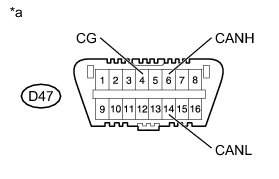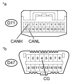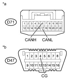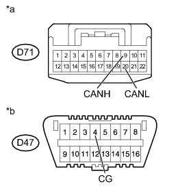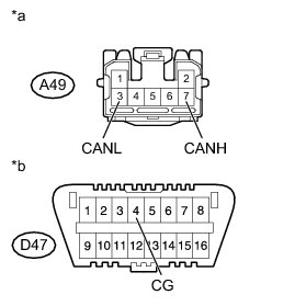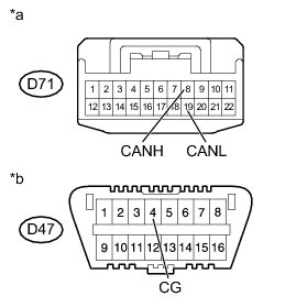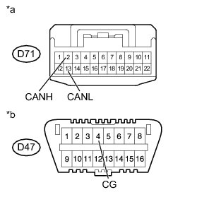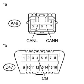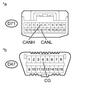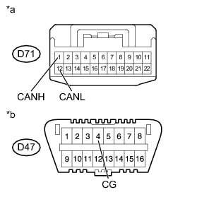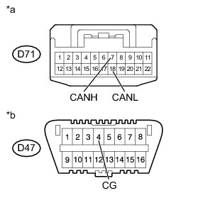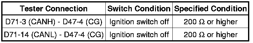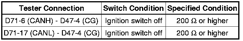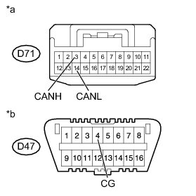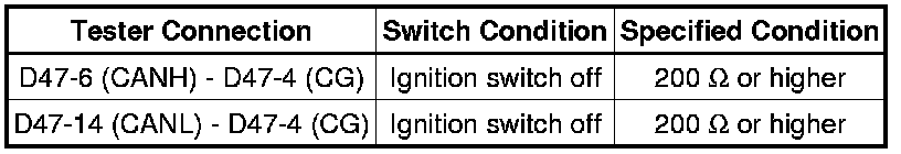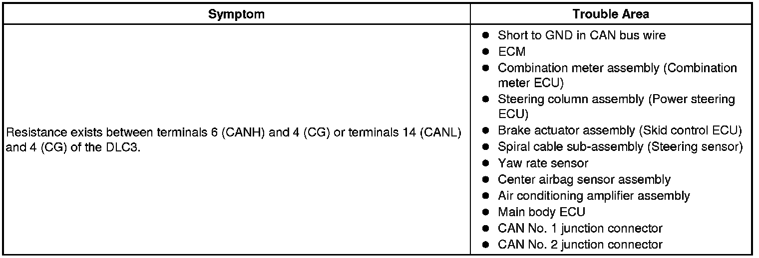 There may be a short circuit between the CAN bus line and GND when there is resistance between terminals 6 (CANH) and 4 (CG) or terminals 14 (CANL) and 4 (CG) of the DLC3.