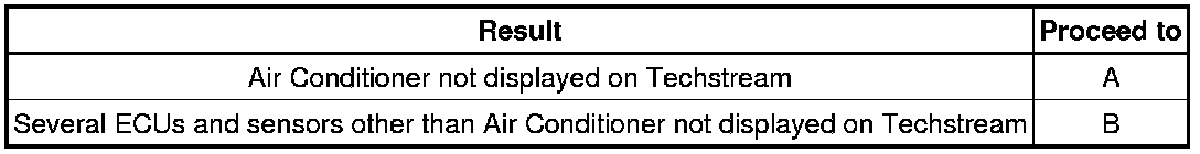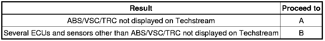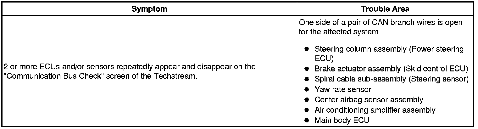 If some ECUs and sensors repeatedly appear and disappear on the "Communication Bus Check" screen, communication between the normal ECUs and sensors and the Techstream may be affected by the incomplete signals that are output from the ECU that has an open circuit in either of its CAN branch wires. In this case, the CAN branch wires for the ECUs and sensors that repeatedly appear and disappear from the screen are normal and the ECU that is not displayed on the screen may be the main cause of the problem (this ECU may have an open circuit in either of its CAN branch wires).