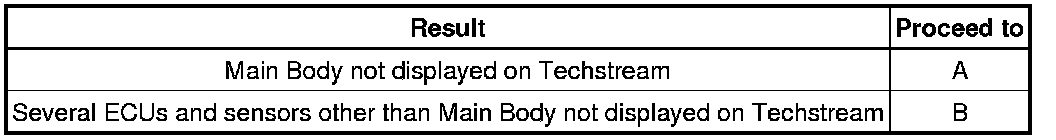 If some ECUs and sensors are not displayed on the "Communication Bus Check" screen of the Techstream and some ECUs and sensors repeatedly appear and disappear on the screen when the CAN main bus wires are normal (there is no open, short, short to +B or short to GND in the main bus wires), there may be an open circuit in either of the CAN branch wires.