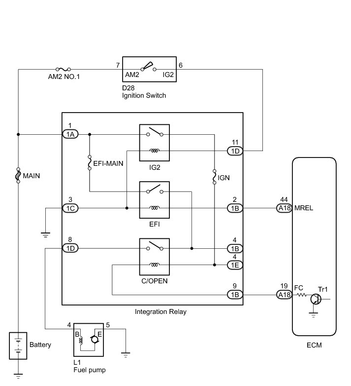 When the engine is cranked, the ST (Starter) relay drive signal is input to the STA terminal of the ECM, and NE signal generated by the crankshaft position sensor is also input to the NE+ terminal. Thus, the ECM interprets that the engine has been cranked, and turns the transistor Tr1 in the ECM internal circuit ON. The current flows to the C/OPEN (Circuit Opening) relay by turning the Tr1 ON. Then, the fuel pump operates.