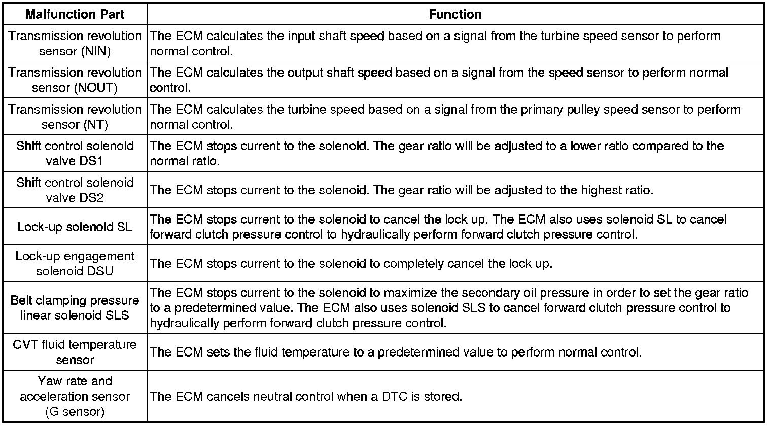 This function minimizes the loss of the Continuously Variable Transaxle (CVT) system functions when a malfunction occurs in a sensor or solenoid.