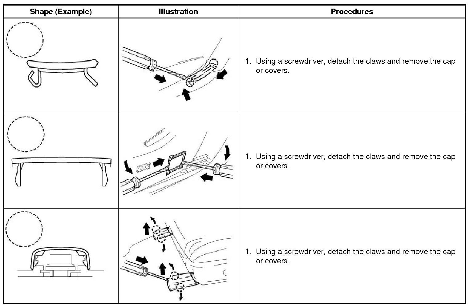 (1) The removal and installation methods of typical claws used for vehicle body parts are shown in the table below.