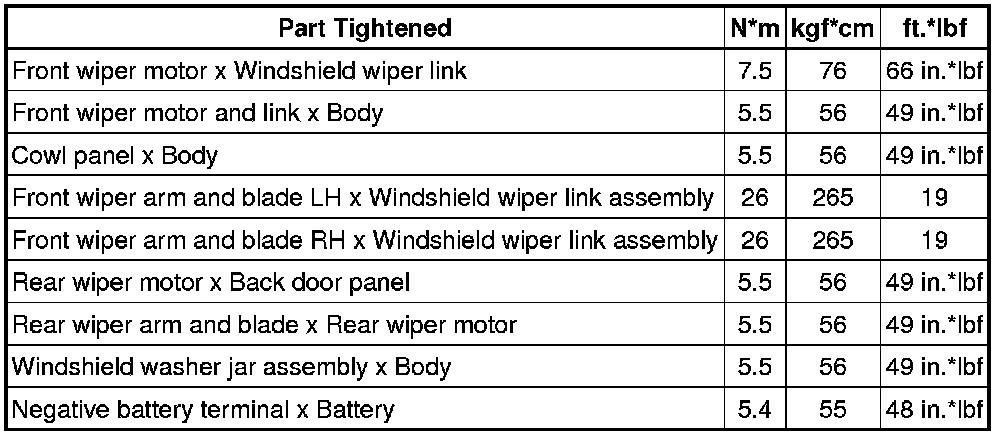 SPECIFICATIONS: WIPER / WASHER: TORQUE SPECIFICATIONS