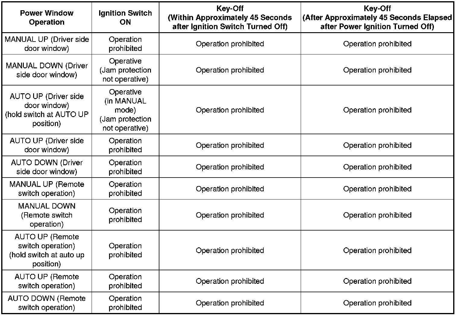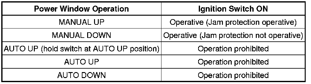 (a) The power window control system prohibits the following power window operation when the pulse sensor for the jam protection function has problems and the window position or the learned value is abnormal.