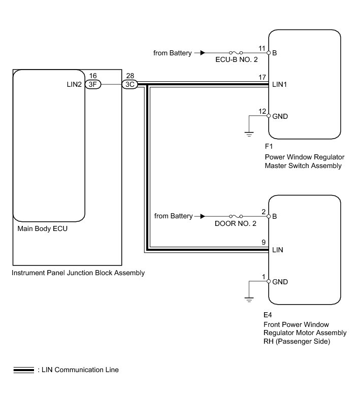 When the ignition switch is ON and the window lock switch is off, the power window regulator master switch sends remote UP/DOWN signals to the front power window regulator motor (passenger side) via the LIN communication line.