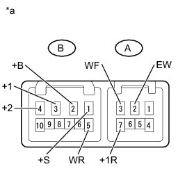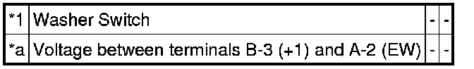 (3) Connect the positive (+) voltmeter terminal to terminal B-3 (+1) and the negative (-) voltmeter terminal to terminal A-2 (EW). Turn the washer switch on and off, and check the voltage between terminals B-3 (+1) and A-2 (EW).