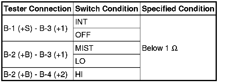 (5) Connect the negative (-) battery lead to terminal B-1 (+S). Operate the intermittent wiper relay and check the voltage between terminals B-3 (+1) and A-2 (EW).