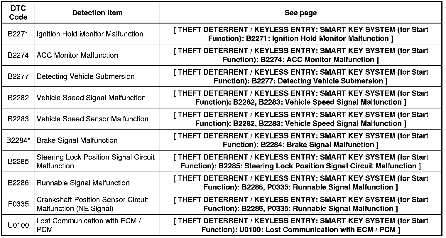 THEFT DETERRENT / KEYLESS ENTRY: SMART KEY SYSTEM (for Start Function): DIAGNOSTIC TROUBLE CODE CHART