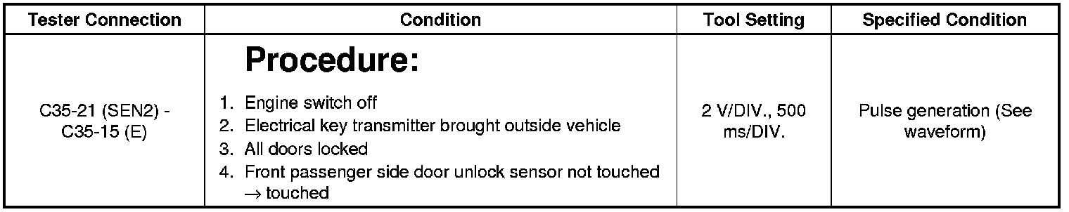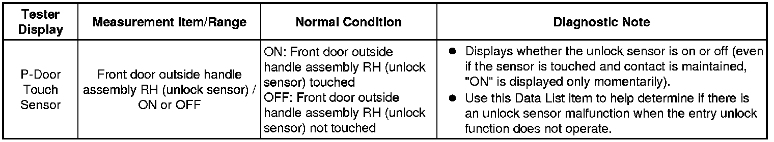 5. CHECK FRONT DOOR OUTSIDE HANDLE ASSEMBLY RH (FRONT PASSENGER SIDE DOOR UNLOCK SENSOR SIGNAL INPUT)