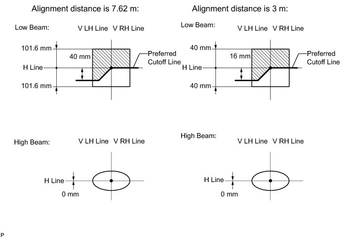 * If the alignment distance is 7.62 m (25 ft.): The low beam cutoff line should be within 101 mm (3.98 in.) above or below the H line as well as 101 mm (3.98 in.) left or right of the V line.