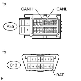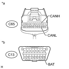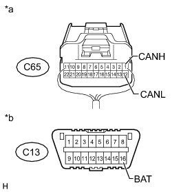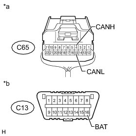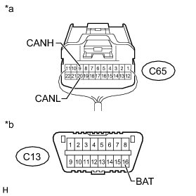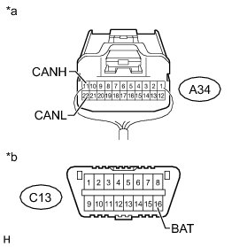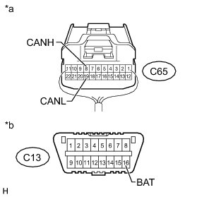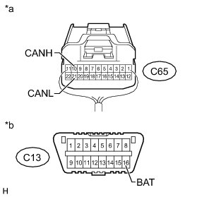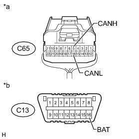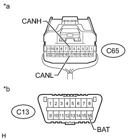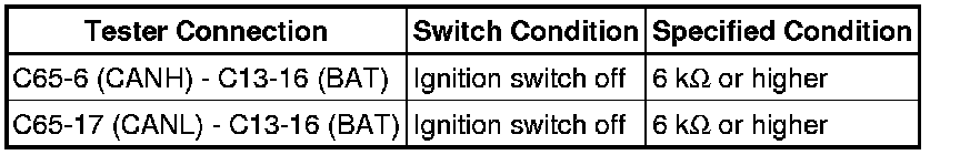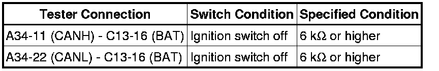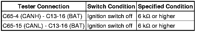 There may be a short circuit between the CAN bus lines and +B when the resistance between terminals 6 (CANH) and 16 (BAT) or terminals 14 (CANL) and 16 (BAT) of the DLC3 is below 6 kOhms.