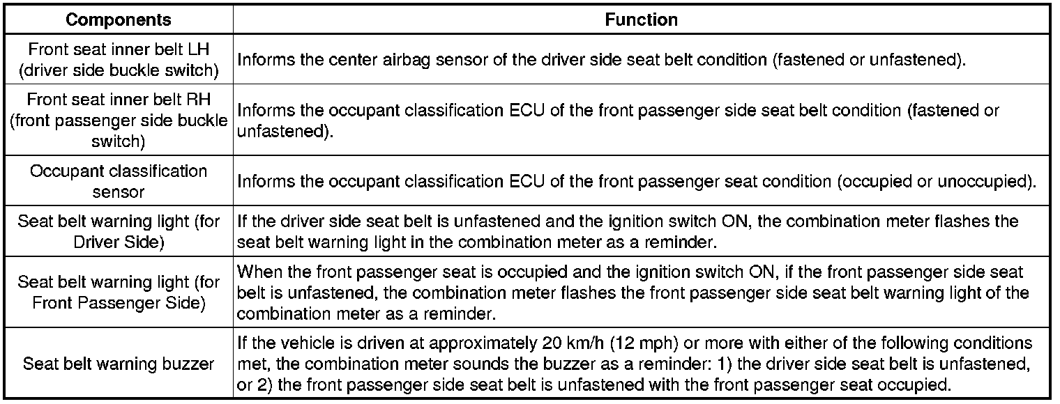 When the ignition switch is turned ON and 1.8 seconds elapse while the driver side seat belt is not fastened, the seat belt warning buzzer in the combination meter sounds 5 times at an interval of 1.2 seconds. When 13.8 seconds have elapsed after turning the ignition switch ON, the shift lever is in D and the vehicle is driven at approximately 20 km/h (12 mph) while the driver or front passenger side seat belt is unfastened, the seat belt warning buzzer in the combination meter sounds at an interval of 1.2 seconds for 9.6 seconds. After that, the buzzer sounds at an interval of 0.4 seconds for 20 seconds.
