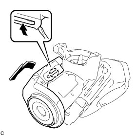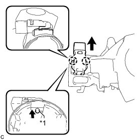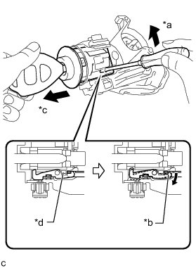 (c) Insert a screwdriver into the hole of the steering column upper bracket. Push the screwdriver upward as shown in the illustration to detach the claw of the ignition switch lock cylinder assembly, and then pull out the ignition switch lock cylinder assembly to remove it.