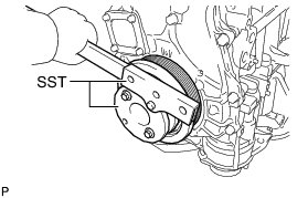 (b) Using SST, hold the crankshaft pulley.