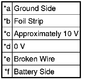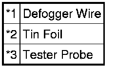 If the defogger wire is not broken, the voltmeter indicates 0 V at the positive (+) end of the defogger wire and gradually increases to approximately 12 V as the meter probe moves to the other end.