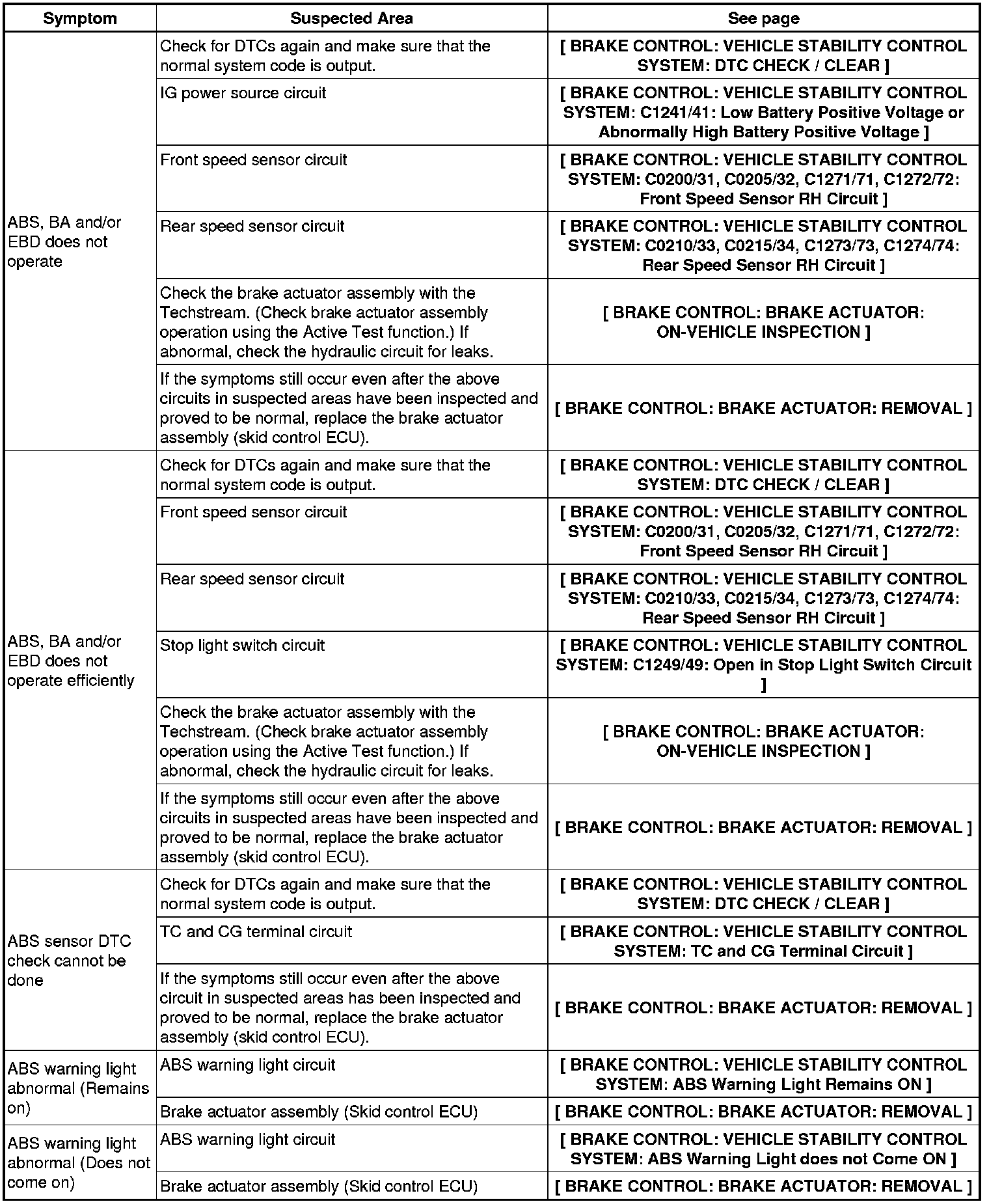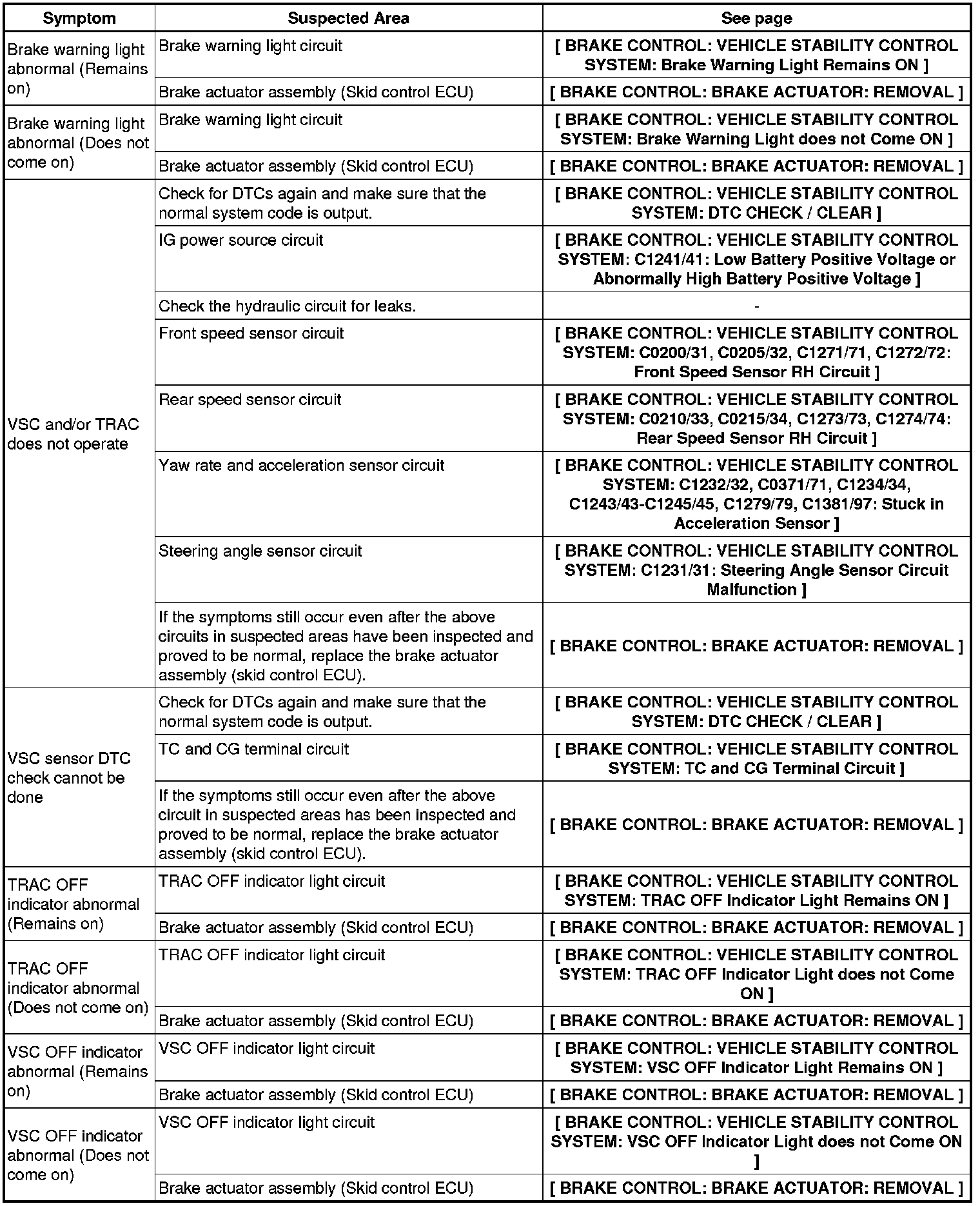 BRAKE CONTROL: VEHICLE STABILITY CONTROL SYSTEM: PROBLEM SYMPTOMS TABLE