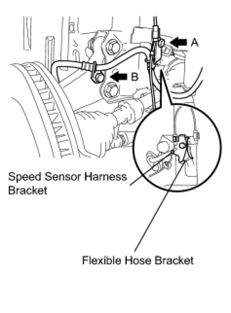 Bolt A tightens the flexible hose bracket and speed sensor harness bracket together. Make sure that the flexible hose bracket is positioned over the speed sensor harness bracket.