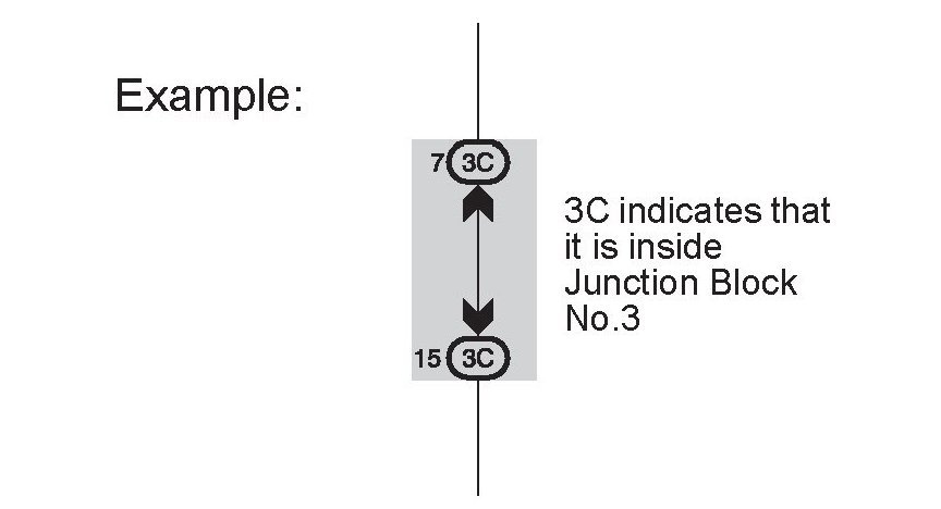 [E] : Indicates the code for the (male and female) connectors which are used to join two wire harnesses. The connector code consists of two alphabetical and one numerical characters.