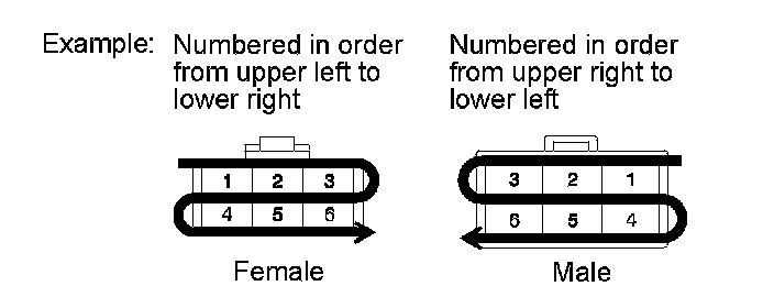 Symbol (Down Arrows) indicates the male terminal connector. Numbers outside connector codes indicate the pin numbers of both male and female connectors.