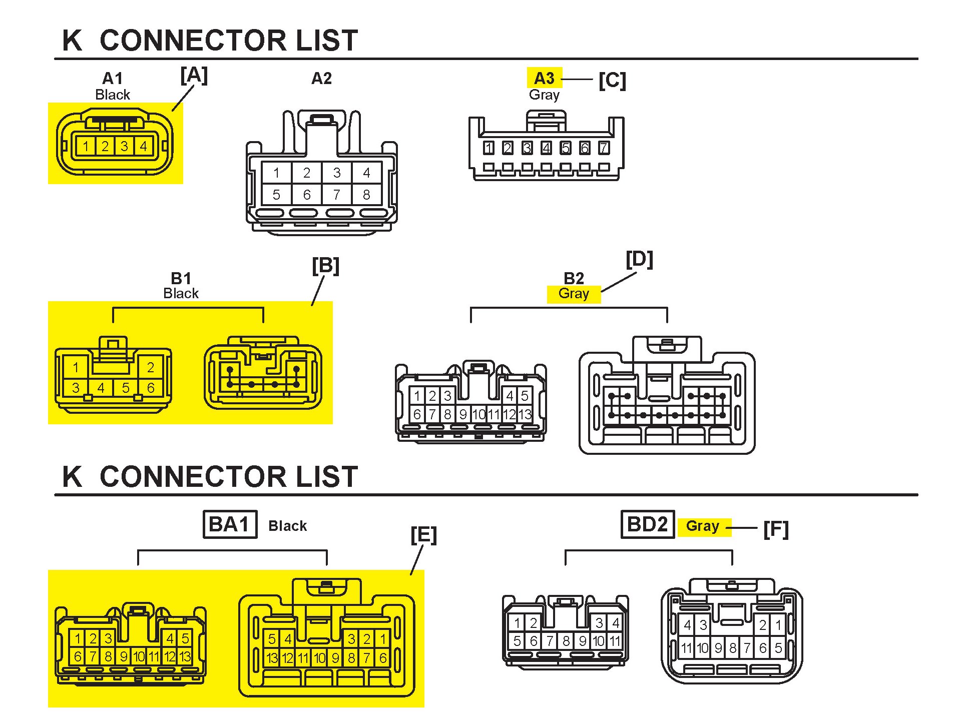 [E] : Indicates the connector shapes which are used to join wire harnesses.