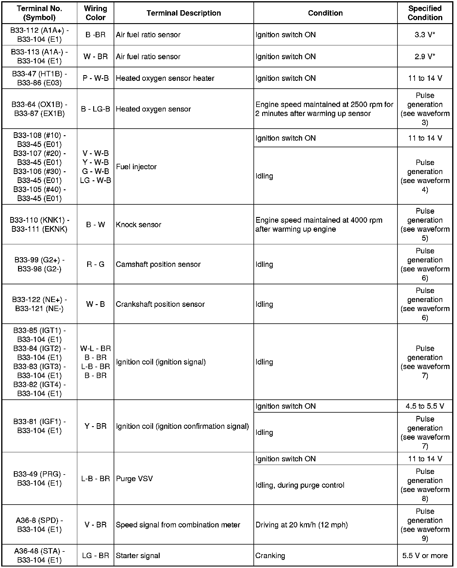 The standard normal voltage between each pair of ECM terminals is shown in the table below. The appropriate conditions for checking each pair of terminals are also indicated. The result of checks should be compared with the standard normal voltage for that pair of terminals, displayed in the Specified Condition column. The illustration above can be used as a reference to identify the ECM terminal locations.