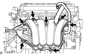 (d) Remove the 5 bolts, 2 nuts and intake manifold.