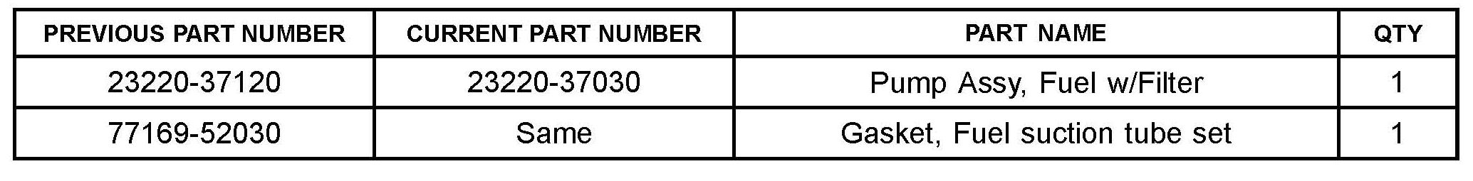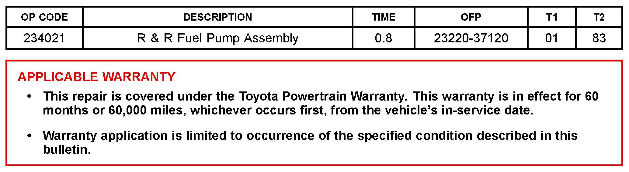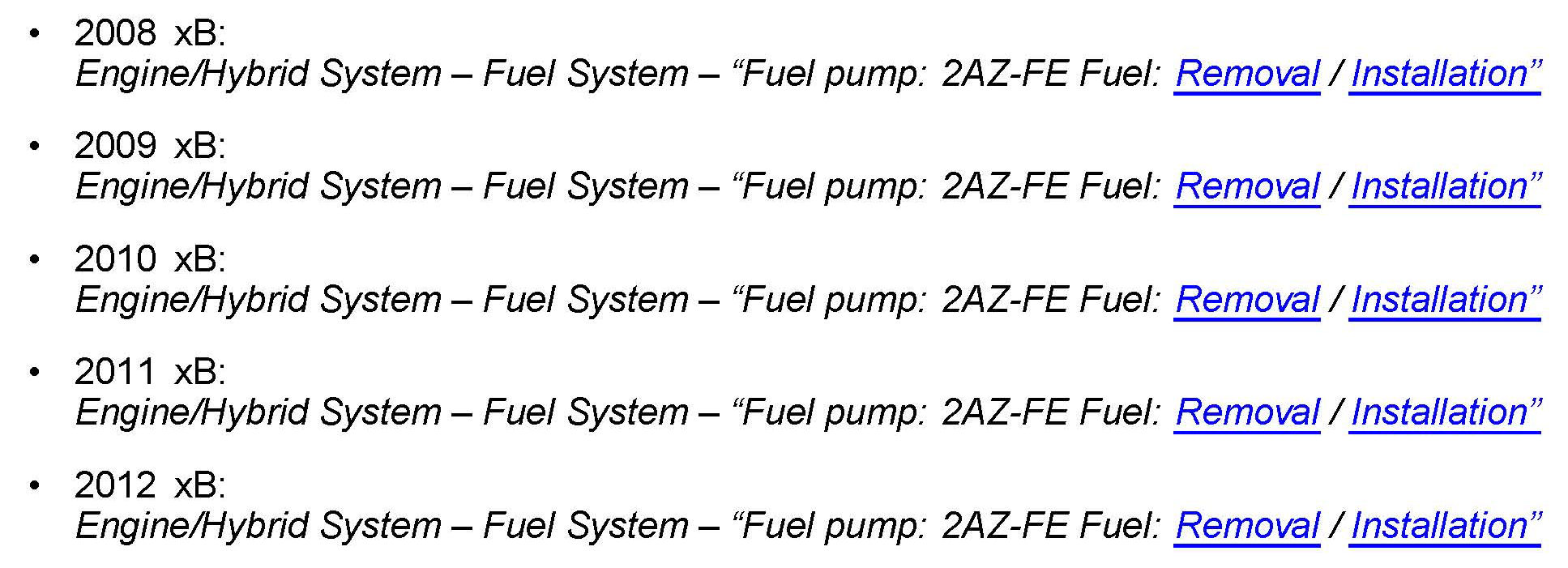 Some 2008 - 2012 model year xB vehicles may exhibit a temporary extended crank condition when attempting to start the vehicle following operation in high altitude high temperature and high vehicle load conditions. Replace the fuel pump to address this condition.