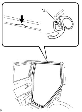 (a) Align the paint mark on the weatherstrip LH and the protruding portion on the body indicated by the arrow in the illustration, and install the rear door opening trim weatherstrip LH.