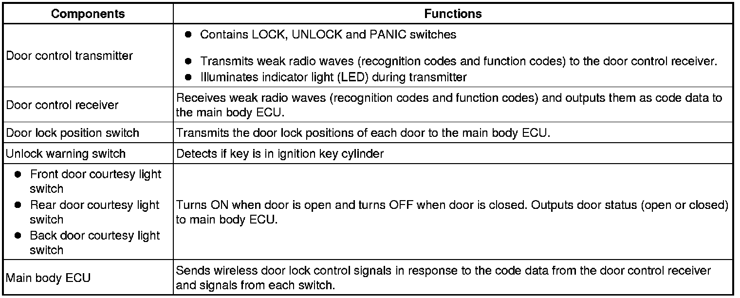 (a) The wireless door lock control system functions to lock and unlock all the doors from a distance. The system is controlled by a hand-held transmitter which sends radio waves to the door control receiver. The main body ECU performs an ID code identification process and engages the door lock control.