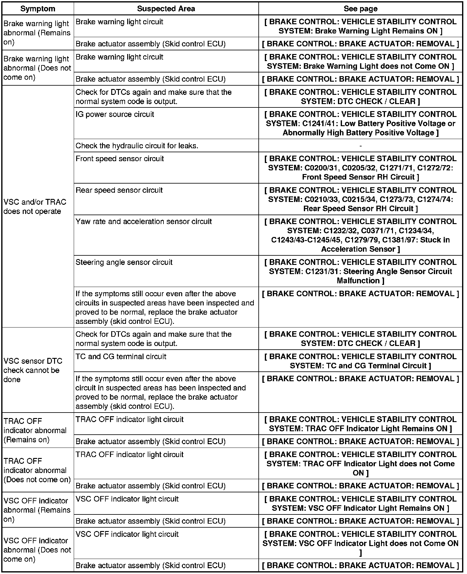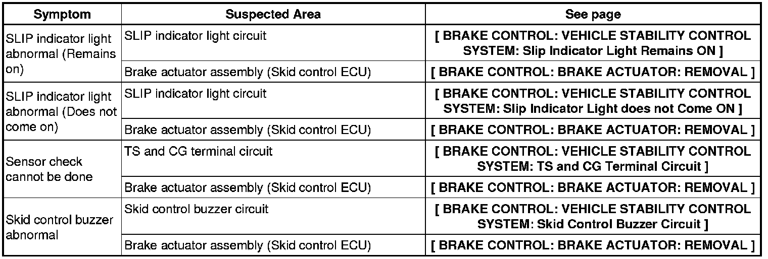 BRAKE CONTROL: VEHICLE STABILITY CONTROL SYSTEM: PROBLEM SYMPTOMS TABLE
