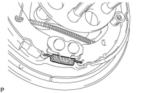 (d) Remove the shoe return spring from the rear brake shoe and remove the parking brake shoe strut set.