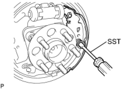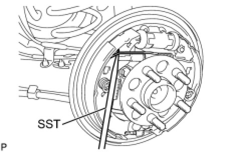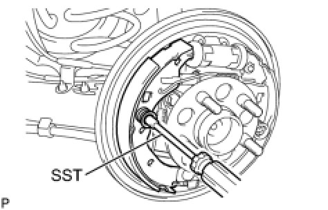 (c) Using SST, install the rear brake shoe, pin, shoe hold down spring and shoe hold down spring cup.