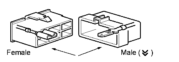 Symbol (Down Arrows) indicates the male terminal connector. Numbers outside connector codes indicate the pin numbers of both male and female connectors.