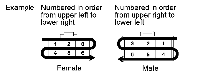 [J] : Indicates the pin number of the connector. The numbering system is different for female and male connectors.