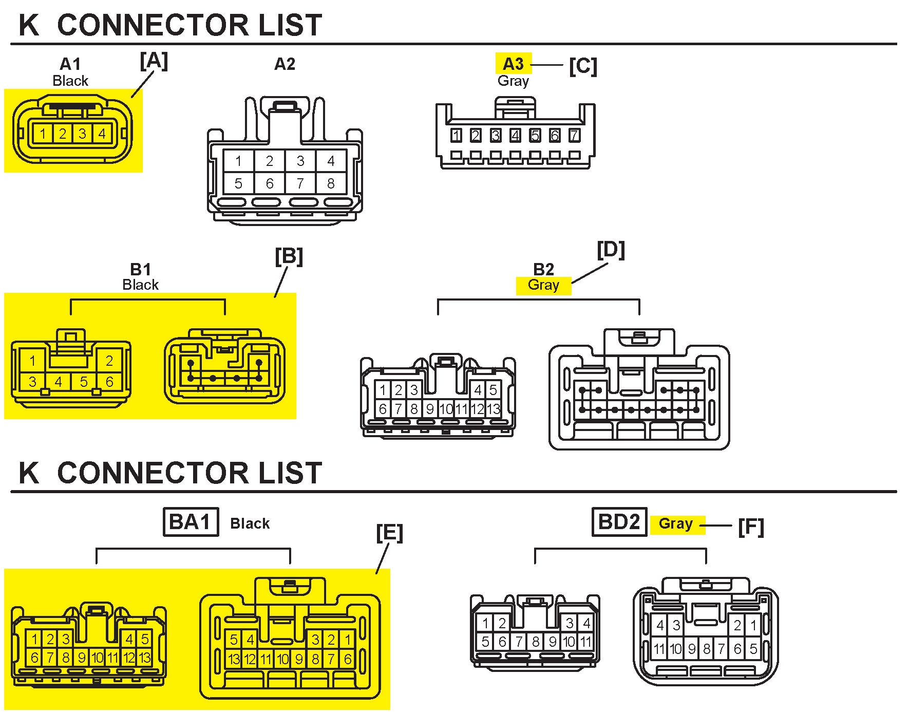 [E] : Indicates the connector shapes which are used to join wire harnesses.