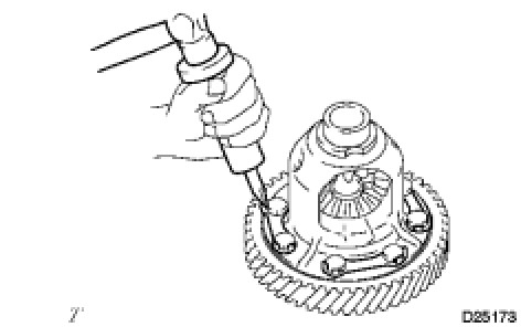 (d) Using a plastic hammer, remove the front differential ring gear from the differential case.