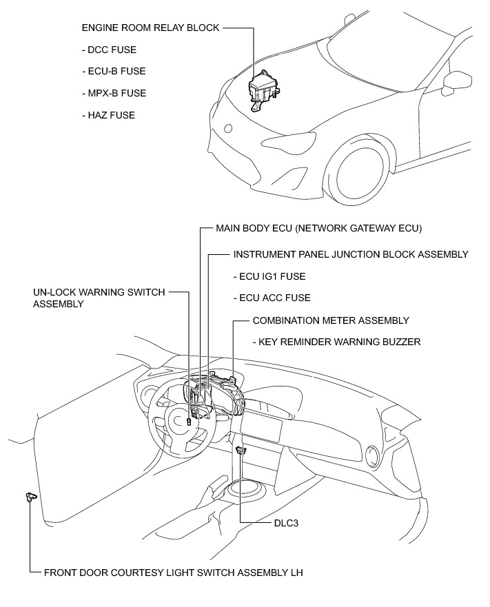 DOOR LOCK: KEY REMINDER WARNING SYSTEM: PARTS LOCATION; 2013 MY FR-S [03/2012 -]