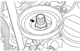 (b) Remove the oil pan drain plug and drain the oil into a container.