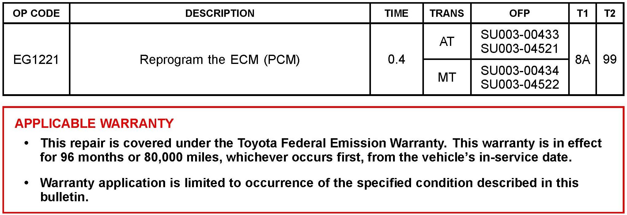 Follow the procedures outlined in Service Bulletin No. S-SB-0003-10 "Techstream ECU Flash Reprogramming Procedure", and flash the ECM (PCM) with the NEW calibration file update.