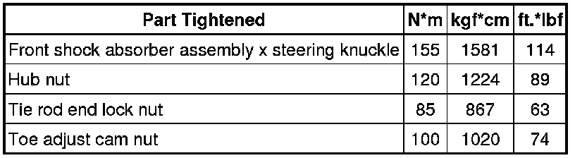 SPECIFICATIONS: ALIGNMENT / HANDLING DIAGNOSIS: TORQUE SPECIFICATIONS; 2013 MY FR-S [03/2012 -]