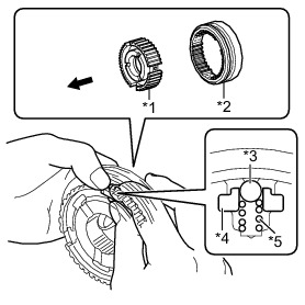 (b) As shown in the illustration, install the No. 4 transmission hub sleeve to the No. 4 transmission clutch hub, and install the 3 No. 1 synchromesh shifting keys and 3 No. 1 synchromesh shifting key springs all together, and then install the 3 synchromesh shifting key balls.