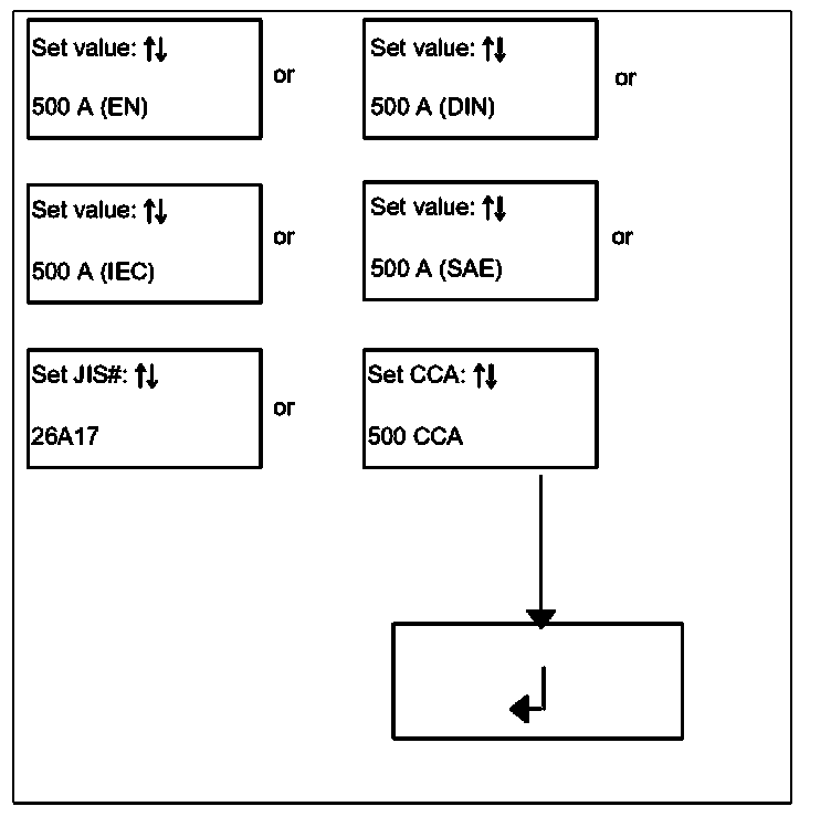 5. Follow the menu selection and select the test standard for the cold cranking amps.