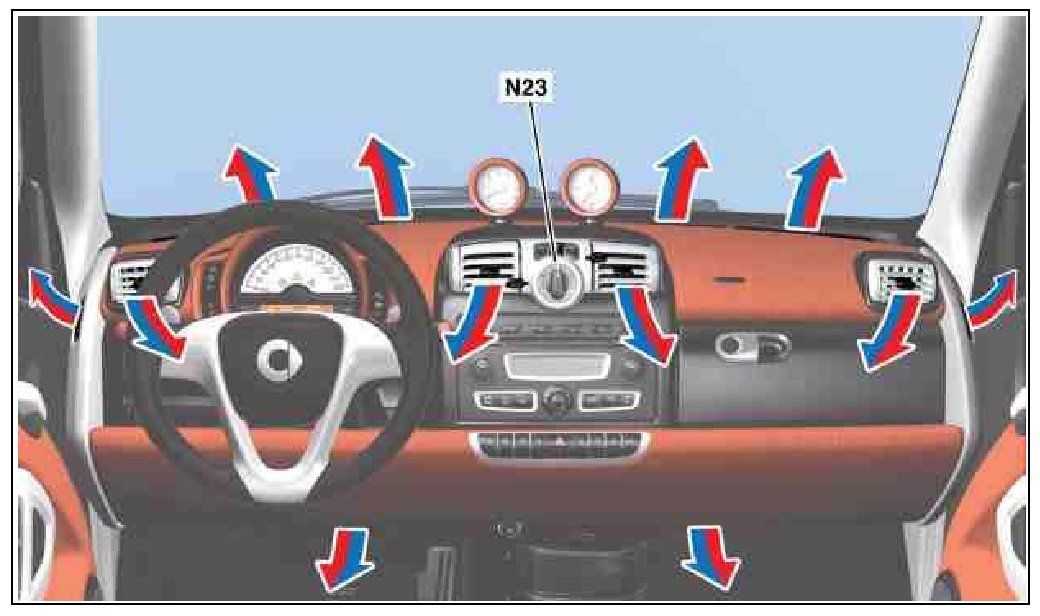 By actuating the air recirculation switch (N23s3) on the heater/AC operating unit, the air recirculation flap actuator motor is actuated, which closes the air recirculation flap. As a result, supply of outside air is prevented; the air only circulates in the vehicle interior and unpleasant odors and harmful gases are kept out. The visual feedback of air recirculation mode takes place via the light-emitting diode integrated in the air recirculation switch.