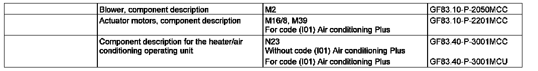 On vehicles without code (I01) Air conditioning Plus, the blend air flap is adjusted mechanically by the temperature preselection slider switch in the heater/AC operating unit by means of a cable. Depending on the actuation of the blend air flap, it opens or closes the air passage through the heater heat exchanger. The blower switch (S98/1) integrated in the heater/air conditioning control unit can be used to regulate the air flow over the blower motor (M2).