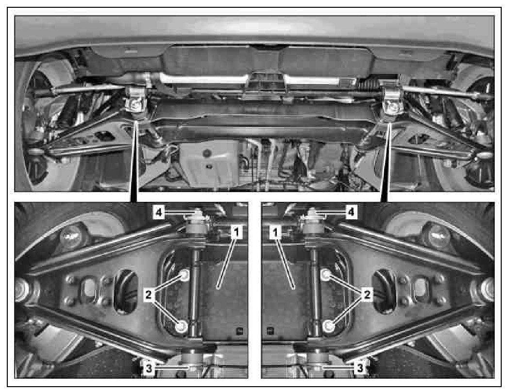 5 Tighten bolts (2) on front axle (1).