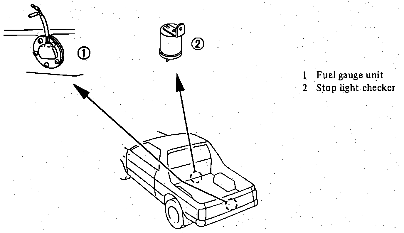 Fuel Gauge Sending Unit & Stop Lamp Checker Locations.: