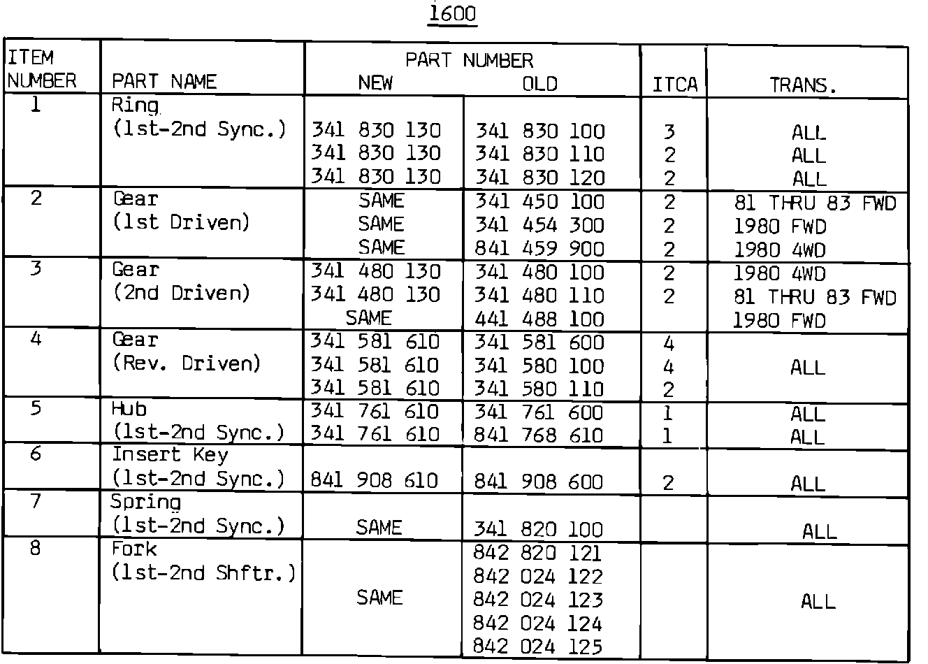 This Service Bulletin is provided for information onlyShould you encounter the need to perform repair work on a 1980 through 1983 Manual Transmission vehicle, be advised of the following part number supersessions and interchangeability for some of the 1-2 synchro related parts.
