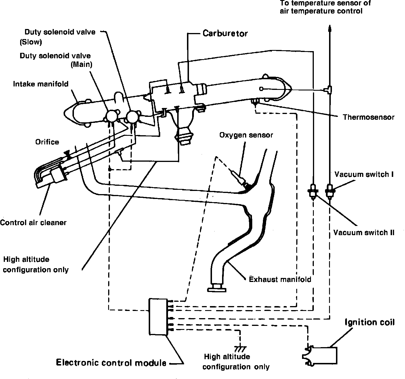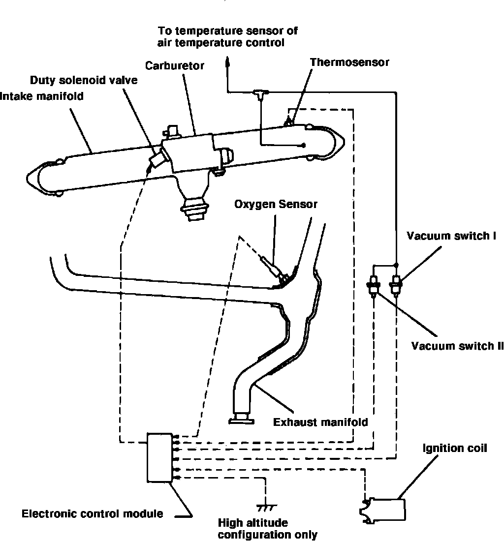 This system, Figs. 1 and 2, is used on 1982-1984 carburetted models and maintains the air/fuel ratio at nearly ideal conditions at all times, thereby controlling emissions while providing satisfactory driveability. The main components of this system are an oxygen sensor, electronic control module, duty solenoid valve, thermosensor, engine speed sensing circuit and two vacuum switches.