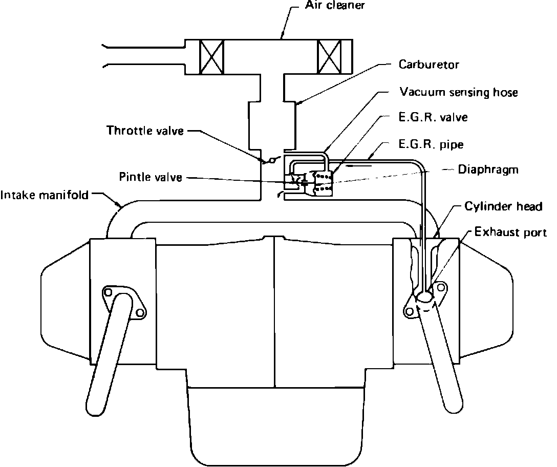 The exhaust gas recirculation system, Fig. 4, is to control oxides of nitrogen (NOx) formation by recirculating part of exhaust gas into the intake manifold and depressing the combustion temperature in the cylinder. The system is designed to circulate part of the exhaust gas from the exhaust port into the intake manifold through the EGR valve. The amount of exhaust gas recirculated is regulated by the EGR valve, which is actuated by vacuum signals according to engine operating conditions.