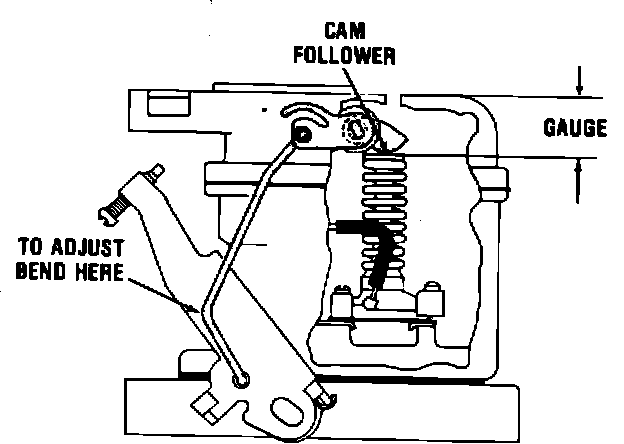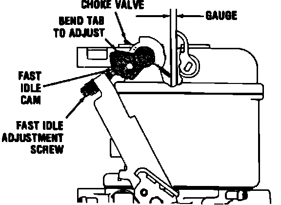 With fast idle screw on second step of the fast idle cam, against shoulder of the first step, close choke valve as far as possible. The dimension between the lower edge of the choke valve and the wall of the air horn should be as specified. Adjust by bending tab.